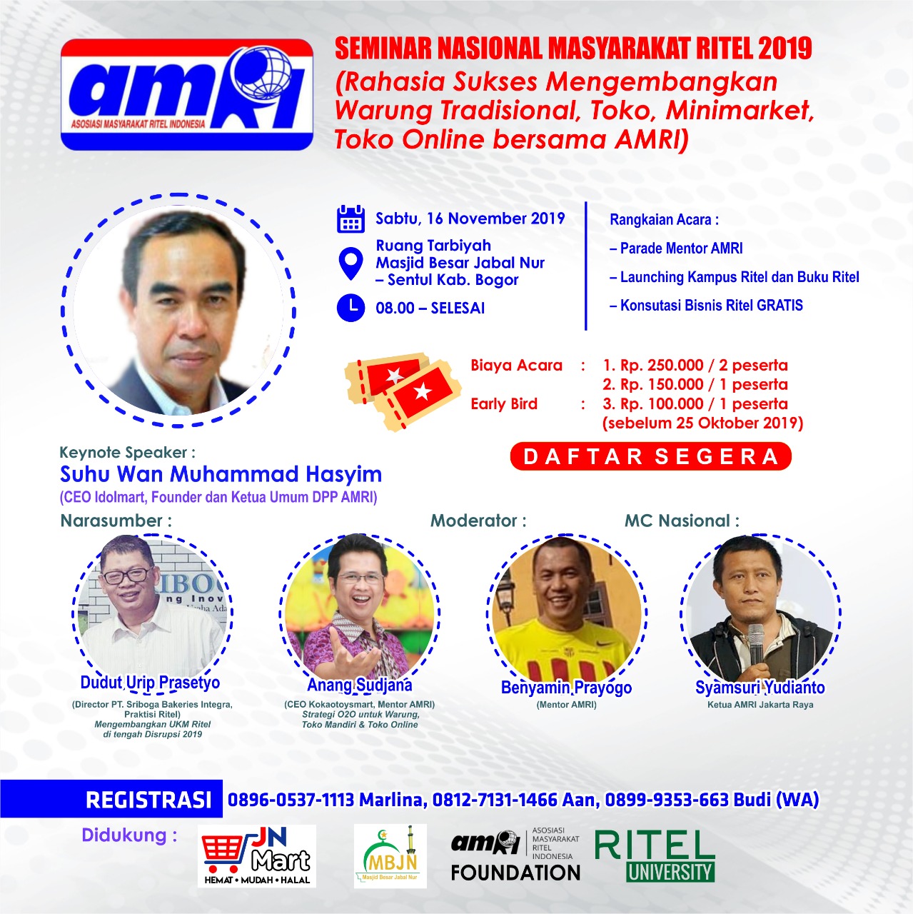 Bertindak sebagai keynote speaker adalah Suhu Wan Muhammad Hasyim. Suhu Wan merupakan CEO Idolmart yang juga founder dan Ketua Umum DPP AMRI. Narasumber yang direncanakan hadir adalah Dudut Urip Rahardjo (Managing Director Sriboga Bakery Integra). Dudut akan membawakan materi tentang Mengembangkan UKM Ritel di Tengah Disrupsi 2019.