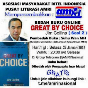 Pusat Literasi AMRI akan mengadakan bedah buku online GREAT BY CHOICE karangan Jim Collins Sessi 2, di group telegram @AMRINasional. Join gratis, silahkan klik http://t.me/amrinasional